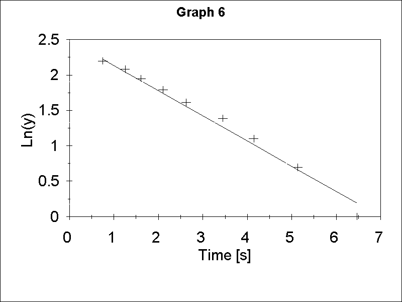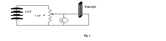 The 1G resistor and bimorph form an RC circuit. If we charge the capacitance of the bimorph to maximum voltage (V0 = 36V) and disconnect the battery the voltage will decay according to the formula V= V0 exp(-t/RC) where t is elapsed time. If the voltmeter with the input resistance of 1M is connected to the bimorph to measure the voltage directly, the time constant is too short to be measured. The deflection of the bimorph is proportional to the voltage so one can measure the decay time indirectly by observing the decay of the deflection after the bimorph was charged. To do so efficiently one can mark several points on the screen between deflection corresponding to the maximum voltage and 0 voltage and measure the time deflection decays to these points. The slope of the plot of logarithm of deflection versus time (Graph 6) or the equivalent calculations will give time constant and knowing R one can obtain C.