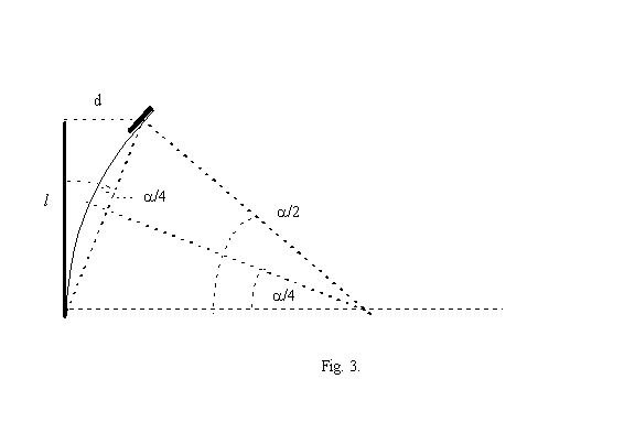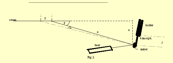 When the bimorph bends into an arc shape the mirror at the end is rotated by an angle /2. This results in a change of a direction of the reflected beam by an angle . The spot formed by the reflected beam on the screen moves by a distance y (see Fig. 2.). If the angle between the reflected beam and the screen is (<90 degrees to increase accuracy) the small angle by which the laser beam is deflected due to the movement of the bimorph is given by = y sin/D = yx/D2 (y<<D).