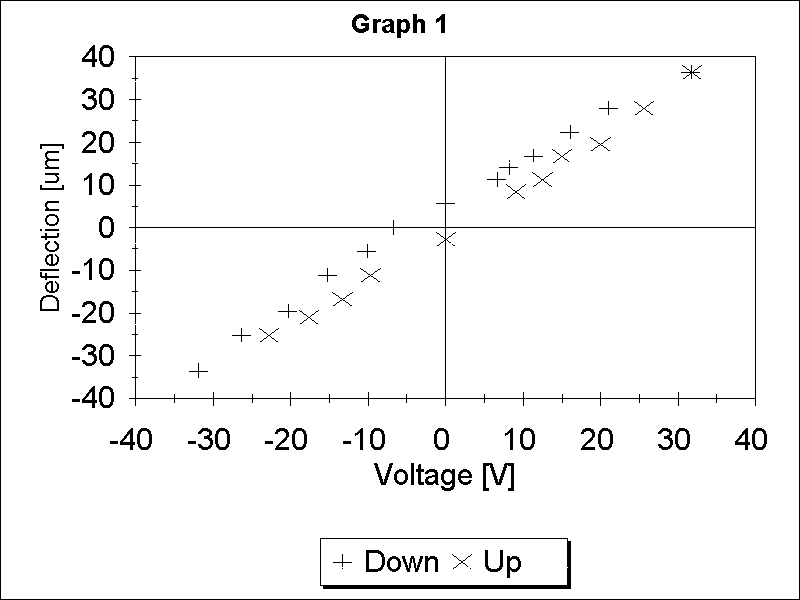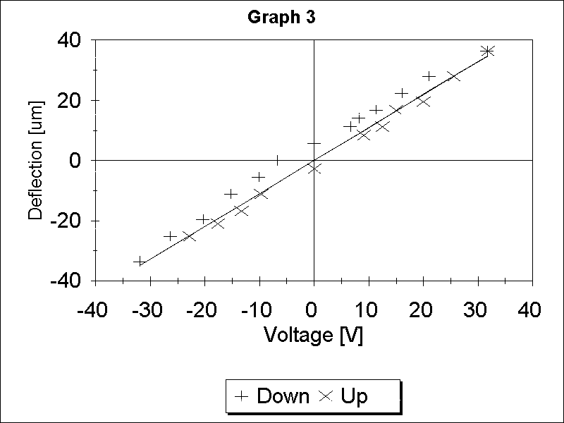 If hysteresis is ignored the data from the Graph 1 can be fitted with a straight line indicating that the displacement is proportional to voltage. See Graph 3.
