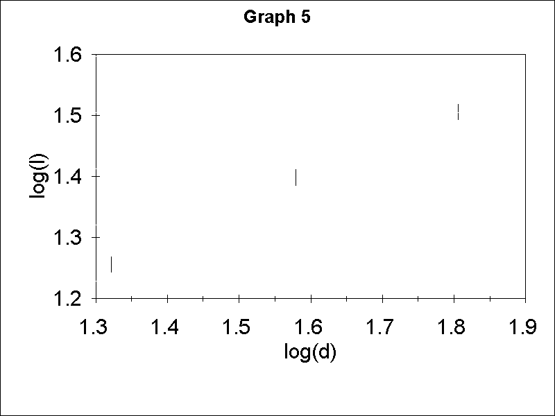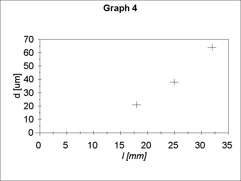 One can conclude from this graph that the displacement is not proportional to the length. One can then plot log d versus log l (see Graph 5) and calculate the slope which will give the value of n. From Graph 5 we obtain n = 1.89 +- 0.13. Notice that l should be measured from the center of the mirror to the edge of the holder.